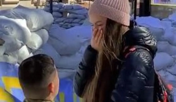 وتظهر الفتاة في الفيديو وهي تمشي قرب متاريس رملية في أحد الشوارع، قبل أن يأتي الجندي الأوكراني ويقدم لها خاتم الخطوبة.