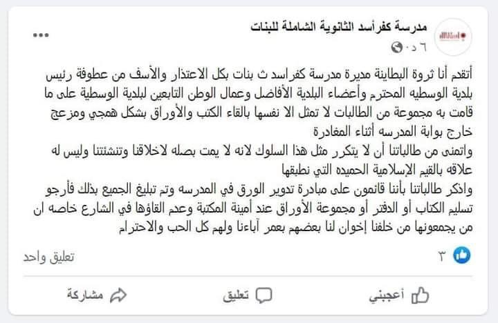 أتقدم أنا ثروة البطاينة مديرة مدرسة كفر اسد ث بنات بكل الاعتذار والأسف من عطوفة رئيس بلدية الوسطية المحترم وأعضاء البلدية الأفاضل وعمال الوطن التابعين لبلدية الوسطية على ما قامت به مجموعة من الطالبات لا تمثل إلا نفسها بإلقاء الكتب والأوراق بشكل همجي ومزعج خارج بوابة المدرسة أثناء المغادرة
