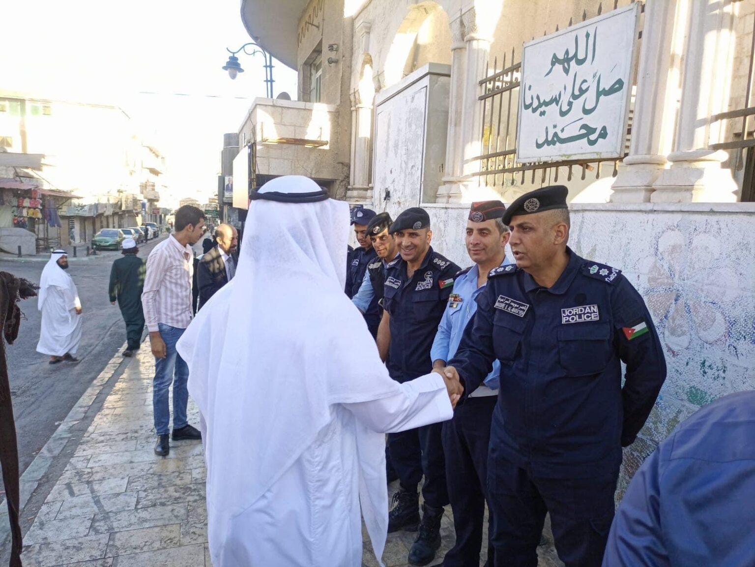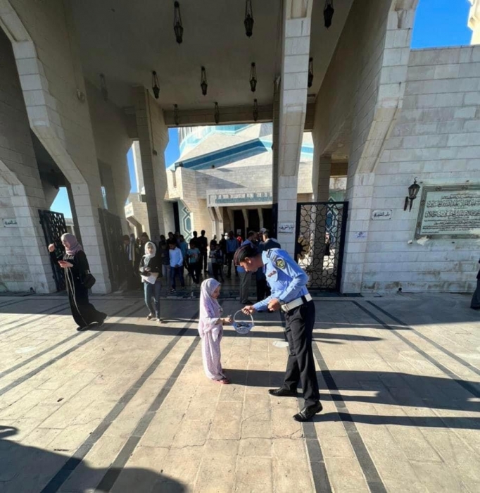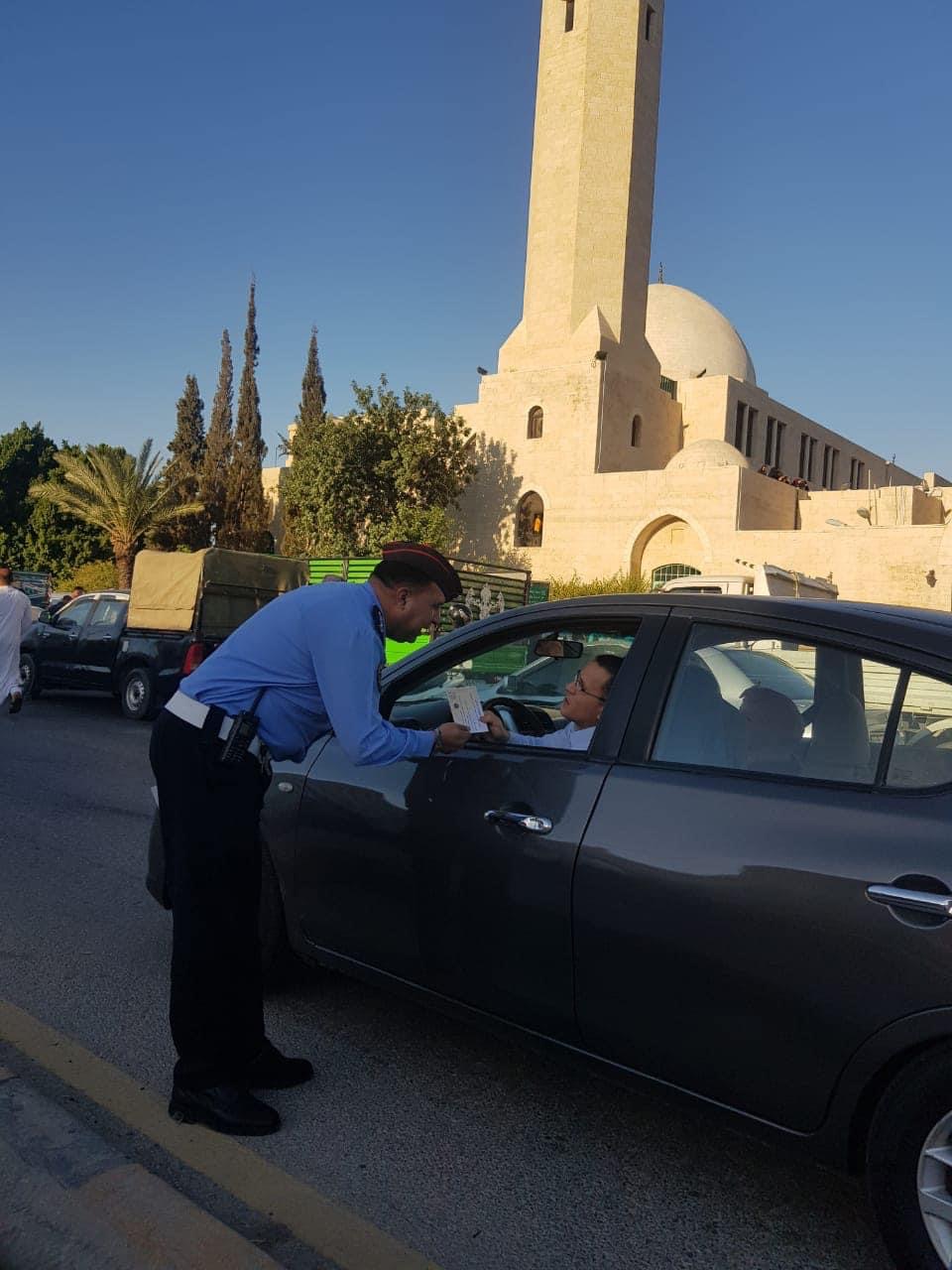 وقامت بتوزيع بطاقات العيد وإرشادات السلامة المرورية عليهم أمام أماكن الصلاة والأضاحي.