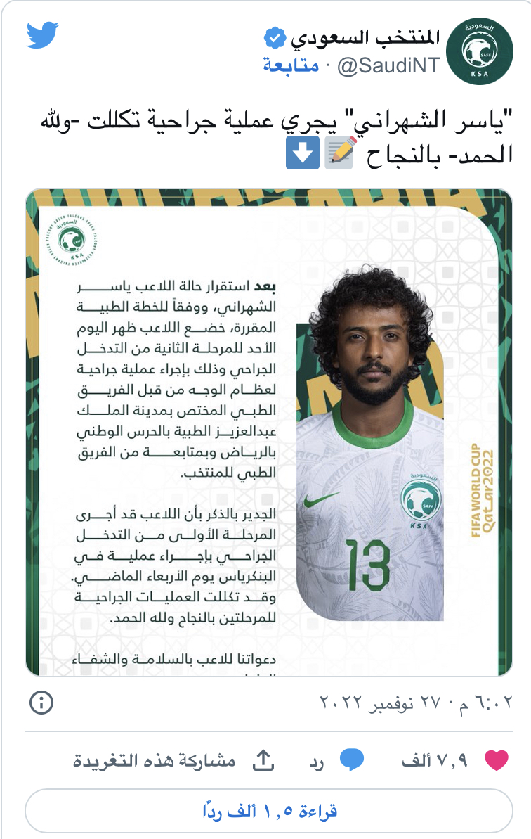 وأصدر المنتخب السعودي بيانا عبر صفحته الرسمية على موقع "تويتر"، جاء فيه: "بعد استقرار اللاعب ياسر الشهراني، ووفقا للخطة الطبية المقررة، خضع اللاعب ظهر اليوم الأحد، للمرحلة الثانية من التدخل الجراحي وذلك بإجراء عملية جراحية في عظام الوجه من قبل الفريق الطبي المختص بمدينة الملك عبدالعزيز الطبية بالحرس الوطني في الرياض، وبمتابعة من الجهاز الطبي للمنتخب.
