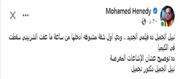 بدوره رد هنيدي على هذه الأقاويل عبر حسابه على موقع (إنستغرام): (نبيل الجميل ده فيلمي الجديد.. ودي أول شقة مشبوهة أدخلها من ساعة ما عفت الشربيني سقطت في الكيميا.. ده توضيح عشان الإشاعات المغرضة..نبيل الجميل دكتور تجميل).