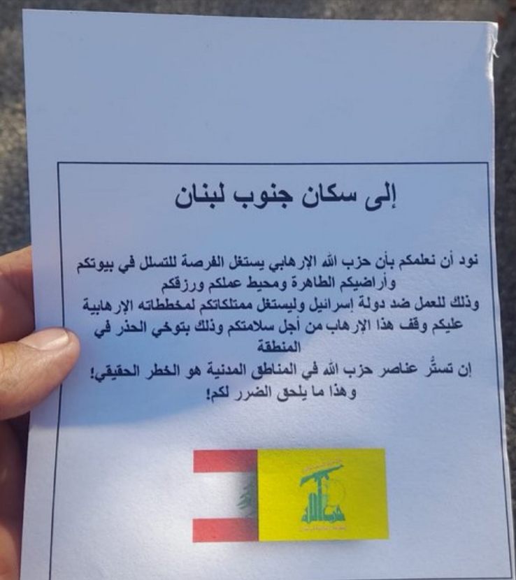 وجاء في المنشور: "إلى سكان جنوب لبنان، نودّ أن نعلمكم بأنّ حزب الله (الإرهابي) يستغلّ الفرصة للتسلّل إلى بيوتكم وأراضيكم الطاهرة ومحيط عملكم ورزقكم، وذلك للعمل ضدّ دولة إسرائيل، وليستغلّ ممتلكاتكم لمخطّطاته الإرهابية".