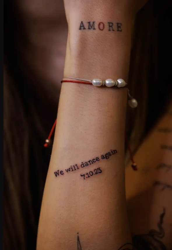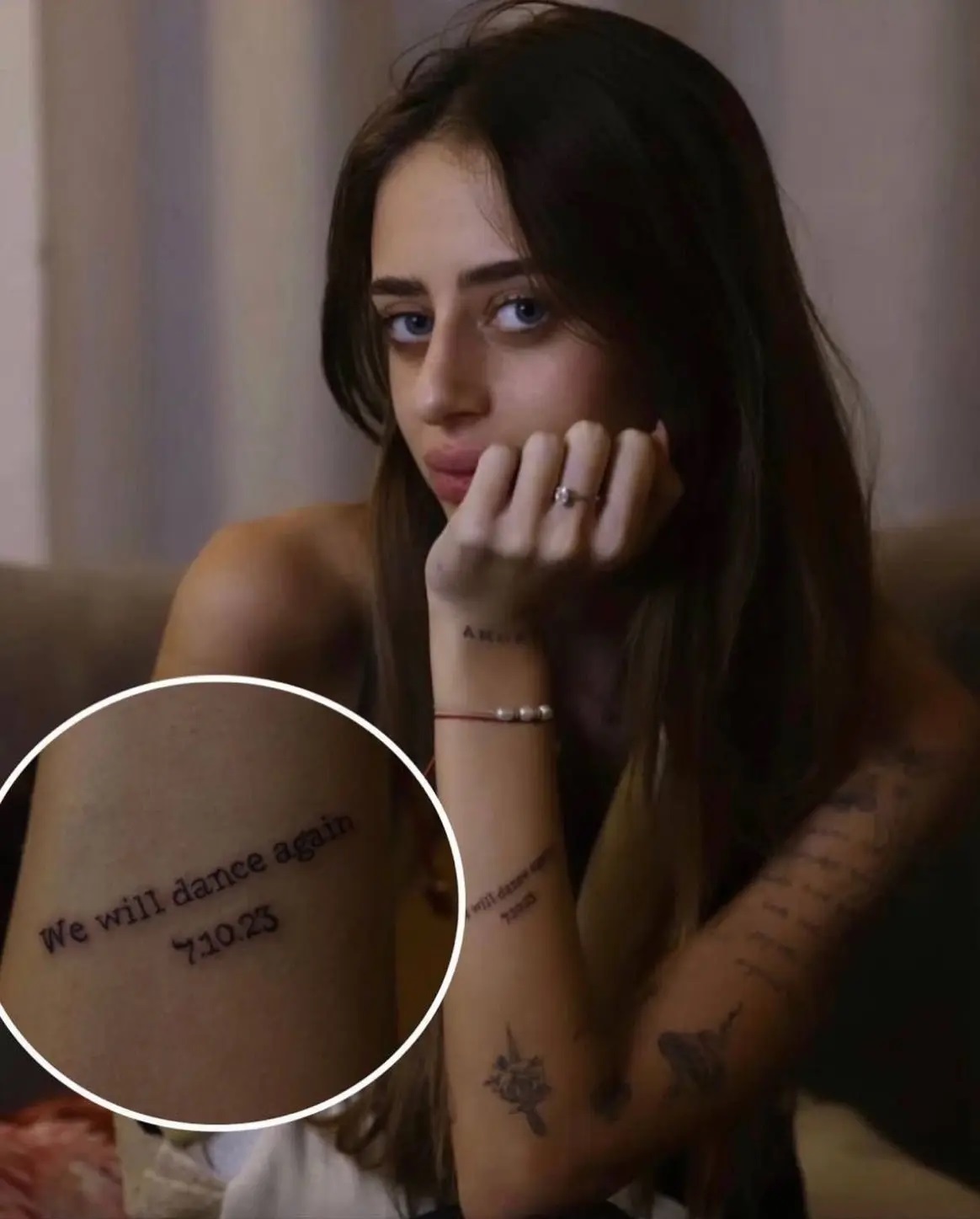 ونقشت المدعوة ميا على جسدها عبارة "سوف نرقص مجددًا" بالأحرف الإنجليزية، مرفقة بتاريخ 7 أكتوبر، وهو اليوم الذي نفذت فيه حركة المقاومة الفلسطينية (حماس) عملية طوفان الأقصى على عددٍ من مستوطنات غلاف غزة والنقب.