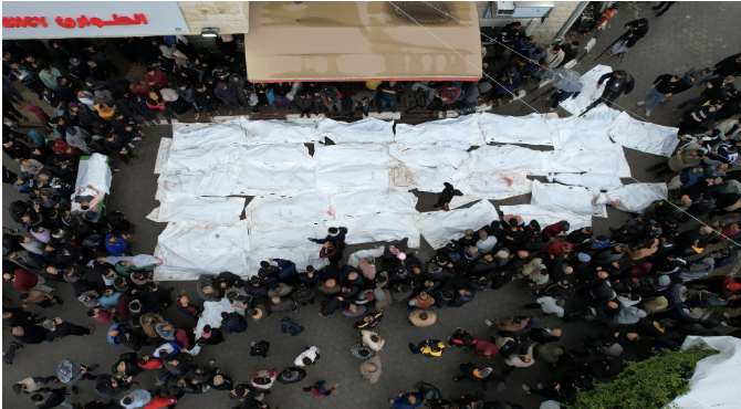 وأشار إلى أن "قوات الاحتلال الاسرائيلي زادت من عدوانها بأشكال متعددة بين إعدامات جماعية ومجازر وإبادة جماعية ومسح أحياء سكنية بمن فيها، وحرمان من الخدمات الصحية وانعدام المقومات الانسانية للنازحين".