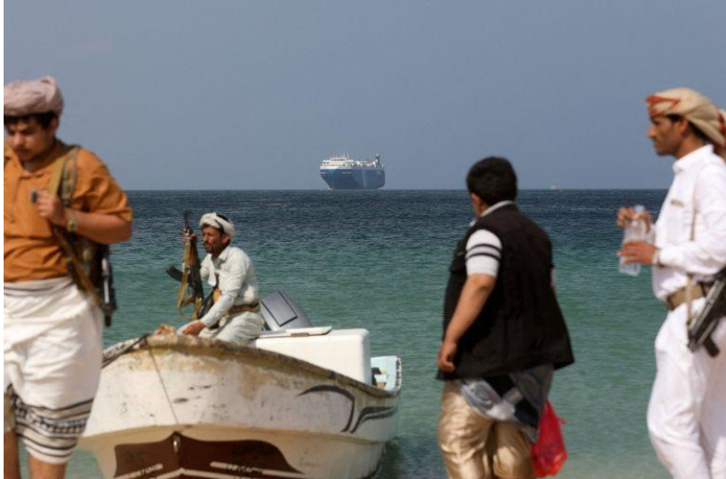 طالب القيادي بجماعة أنصار الله الحوثيين محمد علي الحوثي السفن برفع لافتة "ليست لنا علاقة بإسرائيل" عند الإبحار في البحر الأحمر.