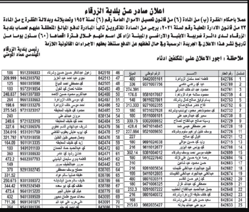 دعت بلدية الزرقاء، 90 مواطنا للمبادرة بدفع المبالغ المتحققة عليهم لحساب البلدية، لدى دائرة ضريبة الأبنية والأراضي، خلال فترة أقصاها 60 يوما. ويأتي ذلك، عملا بأحكام الفقرة (ب) من المادة (6) من قانون تحصيل الأموال العامة رقم (6) لسنة 1952 وتعديلاته، وبدلالة الفقرة (ج) من المادة (23) من قانون الإدارة المحلية لسنة 2021.
