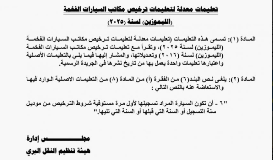 صدر في عدد الجريدة الرسمية اليوم الاربعاء، التعليمات المعدلة لتعليمات ترخيص مكاتب السيارات الفخمة (الليموزين) لسنة (٢٠٢٥).
