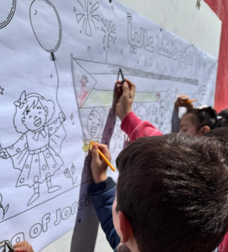 كما رسم الأطفال لوحة جدارية علم الأردن و قاموا بتلوينها بأجواء وطنية تعبر عن فرحتهم بهذه المناسبة ذات الدلالات الوطنية.
