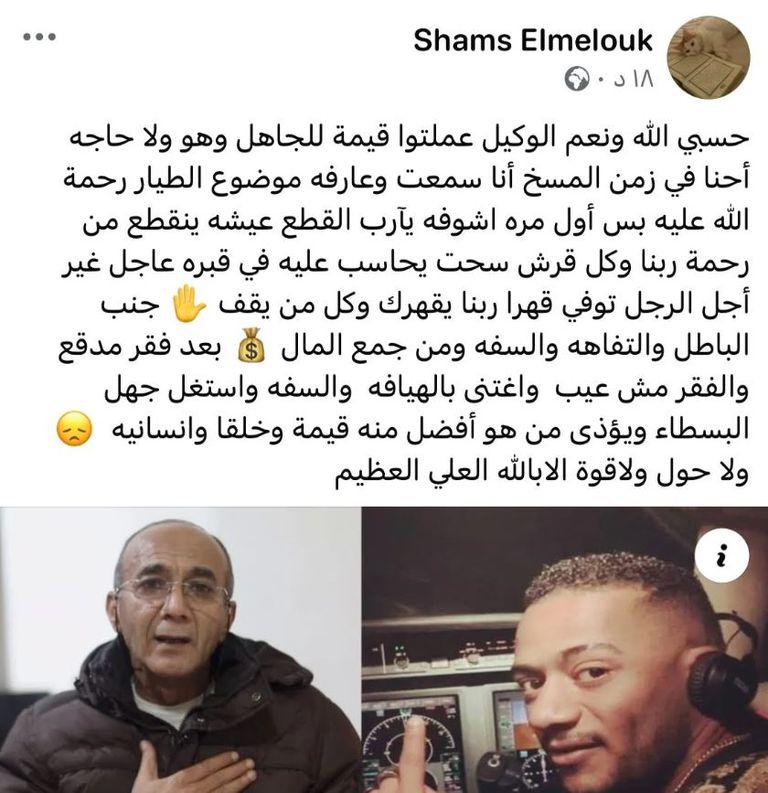 وواصلت هجومها الحاد بقولها: "وكل قرش يُحاسب عليه في قبره عاجلًا غير آجل. الرجل توفي قهرًا، ربنا يقهرك وكل من يقف جنب الباطل والتفاهة والسفاهة، ومن جمع المال"، مؤكدة أن الفقر ليس عيبًا، بل العيب في من يستغل الشهرة ويؤذي غيره.