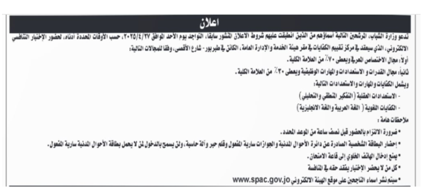 أعلنت هيئة تنمية وتطوير المهارات املهنية والتقنية، اليوم الإثنين، عن حاجتها لتعبئة وظائف شاغرة، فيما دعت وزارة الشباب عدداً من المرشحين لحضور الامتحان التنافسي.