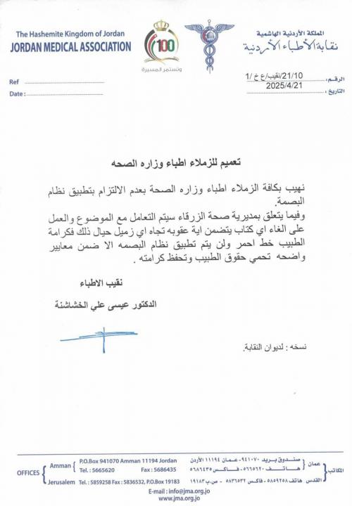 وشدد الدكتور الخشاشنة في التعميم على أن نقابة الأطباء لن تقبل بتطبيق أي نظام لا يراعي كرامة الطبيب ويحفظ هيبته، مشيراً إلى أن أي محاولة لإلزام الأطباء بالبصمة، كما جرى في مديرية صحة الزرقاء، سيتم التعامل معها بجدية تامة.
