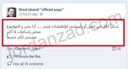 وأعلنت مصادر مقربة من عائلة شرف أن الخبر مجرد شائعة، وأن وائل شرف بصحة ممتازة.