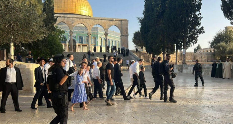 اقتحم مستوطنون، صباح الاثنين، المسجد الأقصى المبارك، بحماية من قوات الاحتلال الإسرائيلي.وأفادت مصادر فلسطينية، بأن عشرات المستوطنين، اقتحموا باحات الأقصى وأدوا صلوات تلمودية ورقصات ورددوا أغنيات بأصواتٍ عالية، شوشت على المصلين المسلمين.