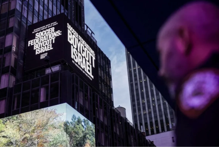 دعا تحالف يضم هيئات مناصرة ومجموعات من المشجعين اتحادات كرة قدم أوروبية إلى مقاطعة إسرائيل عبر لوحة إعلانية في ساحة تايمز سكوير، ليطلقوا بذلك حملة تحت اسم (#جيم أوفر إسرائيل) أو انتهت اللعبة يا إسرائيل قبل أشهر من انطلاق منافسات كأس العالم.ومن المقرر أن تستضيف نيويورك ثماني مباريات في كأس العالم...