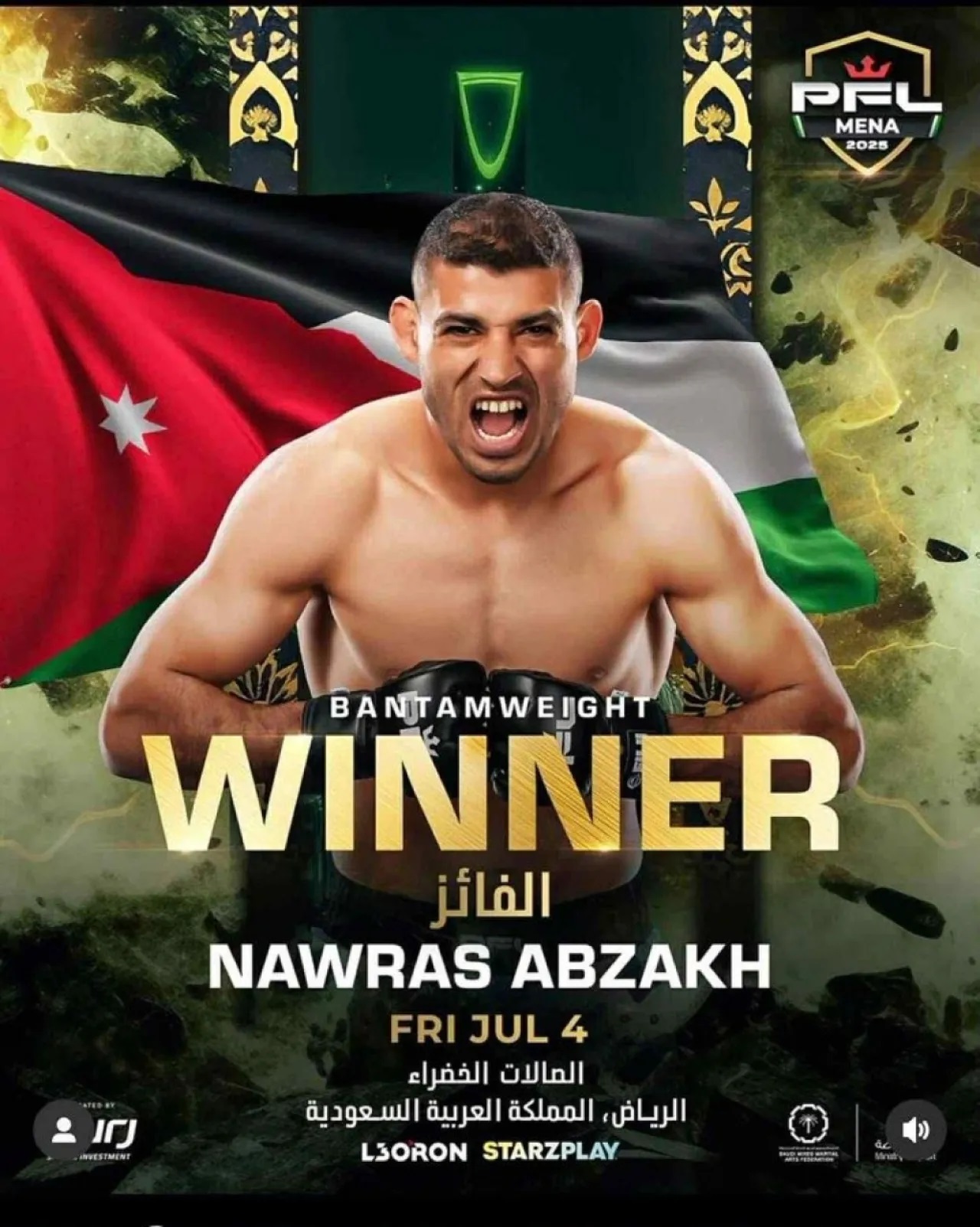 يخوض البطل الأردني نورس أبزاخ الجمعة المقبلة، نزالا قويا في البطولة العالمية لرابطة المقاتلين المحترفين (PFL)، في المنافسات التي تجري في العاصمة السعودية الرياض.ويواجه أبزاخ، خصمًا شرسًا من السويد، في ليلة حماسية يتوقع أن تحظى بحضور جماهيري كبير.ويحمل نورس العلم الأردني بكل فخر بين الجماهير...