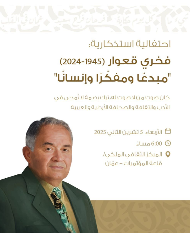 يحتفي أصدقاء ومحبو وعائلة الأديب والصحفي والبرلماني والنقابي الراحل فخري قعوار، الذي انتقل إلى رحمة الله تعالى في العام الماضي، بمسيرته وأفكاره وكتاباته في أمسية تستضيف قادة الفكر والثقافة والسياسة، وذلك في تمام الساعة السادسة من مساء يوم الأربعاء القادم 5/11/2025، في القاعة الرئيسية في المركز...