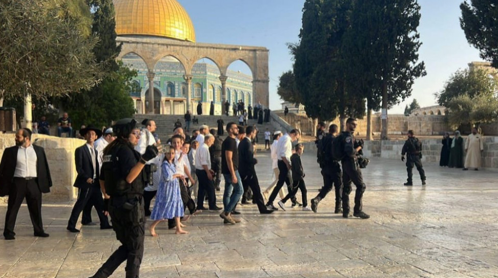 اقتحم مستوطنون، الأحد، المسجد الأقصى المبارك، في مدينة القدس المحتلة، بحماية شرطة الاحتلال الإسرائيلي.وأفادت مصادر فلسطينية، بأن 180 مستوطنا اقتحموا باحات المسجد الأقصى على شكل مجموعات، ونفذوا جولات استفزازية، وأدوا طقوسا تلمودية.