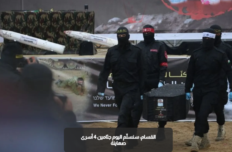 قالت كتائب عز الدين القسام ، انها ستسلم اليوم جثامين 4 أسرى صهاينة.وقالت في بيان مقتضب : في إطار صفقة طوفان الأقصى لتبادل الأسرى القسام ستسلم اليوم جثامين 4 أسرى صهاينة.وأضافت : سنسلم اليوم جثامين الأسرى غاي إيلوز ويوسي شرابي وبيفين جوشي ودانيال بيري.