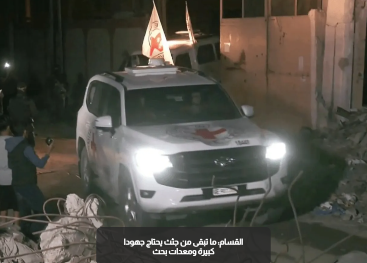 قالت كتائب عز الدين القسام إن المقاومة التزمت بما تم الاتفاق عليه، وسلمت جميع من لديها من الأسرى الأحياء وما بين أيديها من جثث تستطيع الوصول إليها.وأضافت الكتائب أن ما تبقى من جثث للأسرى فتحتاج جهودا كبيرة ومعدات خاصة للبحث عنها واستخراجها، ونحن نبذل جهدا كبيرا من أجل إغلاق هذا الملف.