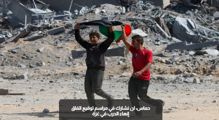 أفاد قيادي في حركة المقاومة الإسلامية (حماس) السبت بأن الحركة لن تشارك في مراسم توقيع الاتفاق الهادف الى إنهاء الحرب في غزة والمقررة في مصر.وقال القيادي في المكتب السياسي للحركة حسام بدران في مقابلة في الدوحة إنّ حماس لن تكون مشاركة في عملية التوقيع. فقط الوسطاء والمسؤولون الأميركيون والإسرائيليون.