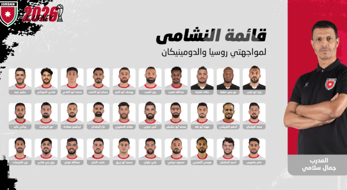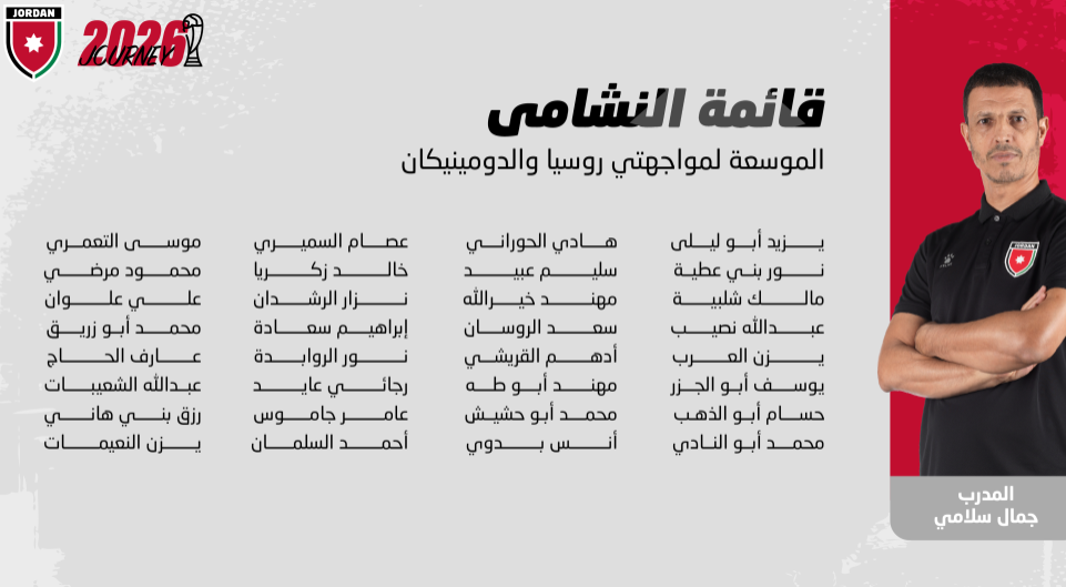 أعلن الجهاز الفني للمنتخب الوطني بقيادة المدرب جمال سلامي، قائمة اللاعبين استعدادا لمواجهتي روسيا والدومينيكان وديا، في إطار التحضيرات لخوض نهائيات كأس العالم 2026.وضمت القائمة 30 لاعبا: يزيد أبو ليلى، نور بني عطية، مالك شلبية، عبدالله نصيب، يزن العرب، يوسف أبو الجزر، حسام أبو الذهب، محمد أبو...