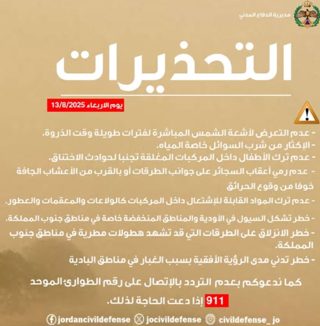 وجهت مديرية الدفاع المدني تحذيرات هامة للأردنيين في ظل ارتفاع درجات الحرارة التي تشهدها المملكة، داعية إلى اتخاذ الاحتياطات اللازمة لتفادي المخاطر المرتبطة بهذه الأجواء الحارة.