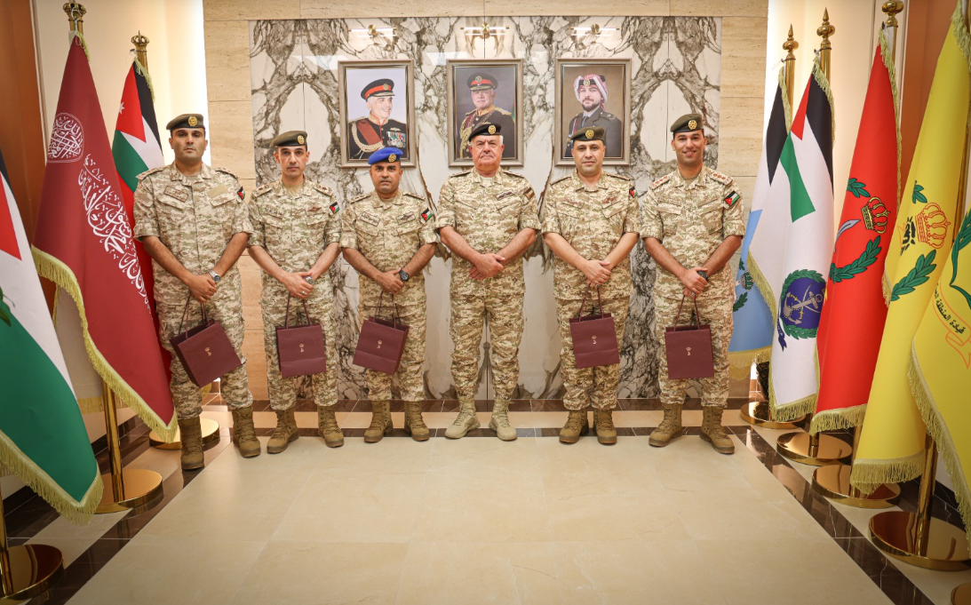 مندوباً عن جلالة الملك عبدالله الثاني القائد الأعلى للقوات المسلحة، كرّم رئيس هيئة الأركان المشتركة اللواء يوسف الحنيطي، الخميس، عدداً من الضباط في القيادة العامة للقوات المسلحة، بهدايا ملكية، تقديراً لجهودهم المتميزة وتفانيهم في أداء واجباتهم المناطة بهم.ونقل اللواء الركن الحنيطي للمكرّمين تحيات...