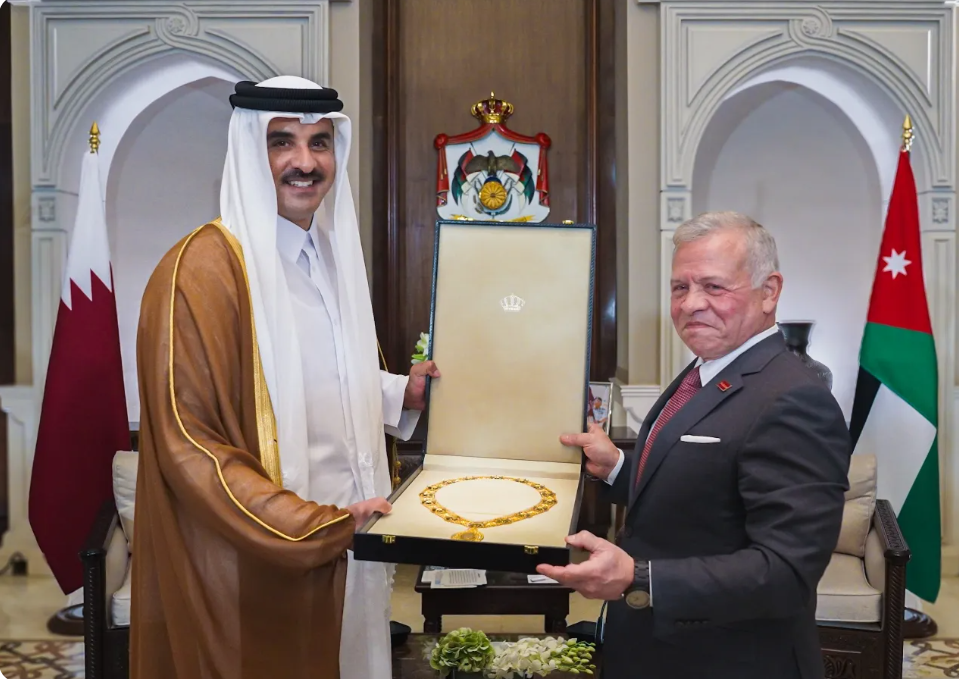 منح الملك عبدالله الثاني الشيخ تميم بن حمد آل ثاني أمير دولة قطر، قلادة الحسين بن علي تقديرا لسموه وتعميقا للعلاقات المتينة التي تجمع البلدين الشقيقين، وبمناسبة الزيارة الرسمية لسموه إلى الأردن