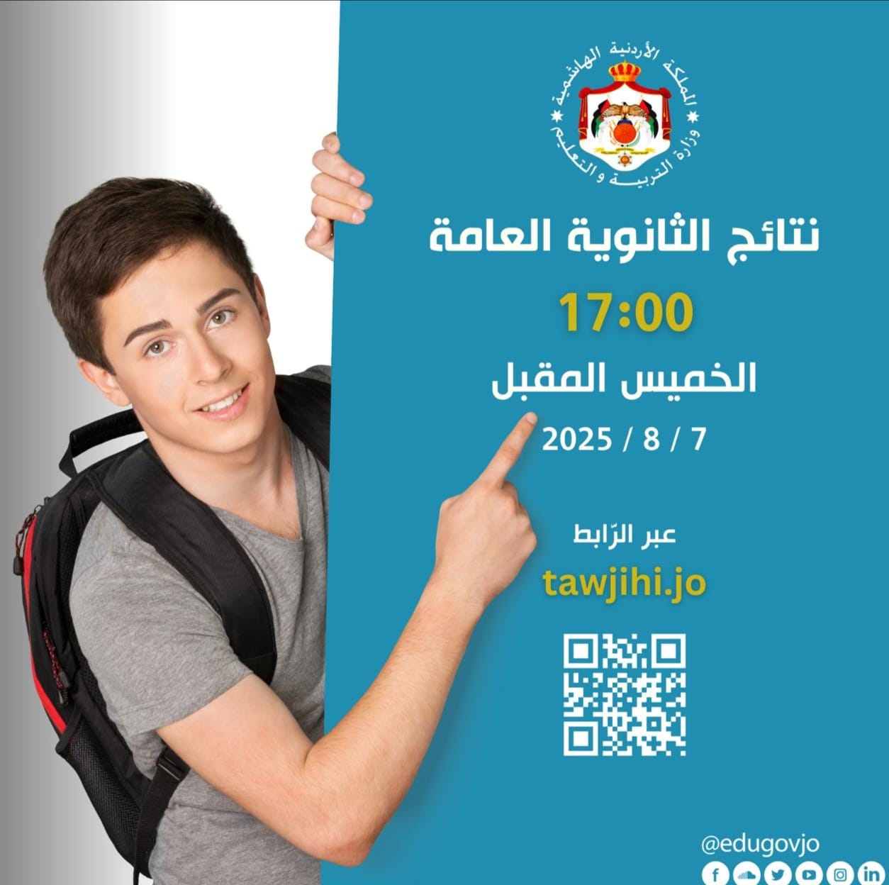 تعقد وزارة التربية والتعليم مؤتمرا صحفيا في تمام الساعة السادسة من مساء يوم غدٍ الخميس، الموافق 7/8/2025، للإعلان عن نسب النجاح في امتحان شهادة الدراسة الثانوية العامة، وأسماء الطلبة الأوائل.ويعقد المؤتمر في مسرح مركز الملكة رانيا العبدالله لتكنولوجيا التعليم والمعلومات/ الشميساني.
