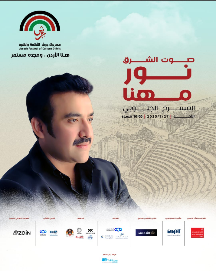 من “غيبي يا شمس” إلى “لُوّح برموشك”، ومن الطرب اللبناني للأغنية الوطنية…ملحم زين يغني للحب، للناس، وللأردن في قلب التاريخ، وبين أعمدة الزمن،يعتلي “الريس” ملحم زين خشبة المسرح الجنوبي، ليمنح جمهور مهرجان جرش ليلة لا تُنسى…الوقت : 10التاريخ: 30/7المكان: المسرح الجنوبي