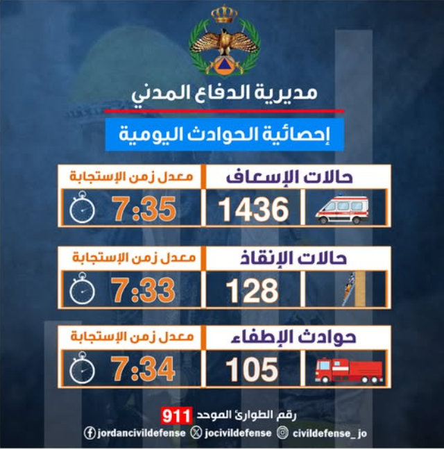 أعلنت مديرية الدفاع المدني عن مجمل تعاملاتها خلال الـ 24 ساعة الماضية، حيث تم التعامل مع 1436 حالة إسعافية بمعدل زمن استجابة بلغ نحو 7 دقائق و35 ثانية.كما باشرت كوادر الدفاع المدني 128 حادث إنقاذ بمعدل استجابة وصل إلى 7 دقائق و33 ثانية، إضافة إلى 105 حوادث إطفاء تم التعامل معها بسرعة استجابة...
