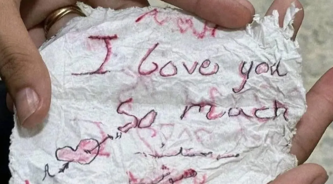 في مشهد إنساني مؤلم من قلب الحرب في غزة، تداول رواد مواقع التواصل الاجتماعي صورة لمنديل ورقي صغيرة كُتب عليها عبارة أحبك كثيراً، وُجدت في جيب شهيد وصل إلى أحد مستشفيات القطاع.ووفقاً لشهادات تداولها مغردون عبر الإنترنت نقلاً عن وسائل إعلام عربية، فقد كشف أحد الأطباء في مستشفى العودة عبر حسابه على...