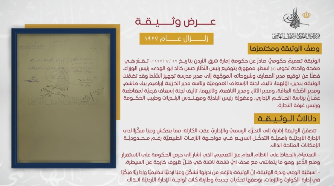 عرض مركز التوثيق الملكي الأردني الهاشمي، وثيقة رسمية تعود إلى 27 تموز 1927، تسلط الضوء على تعميم حكومي أصدرته حكومة إمارة شرق الأردن عقب الزلزال العنيف الذي ضرب المنطقة في ذلك العام، المعروف تاريخيا بـزلزال نابلس الذي امتد تأثيره إلى الأراضي الأردنية.وأوضح المركز في بيان اليوم الأحد، أن أهمية...