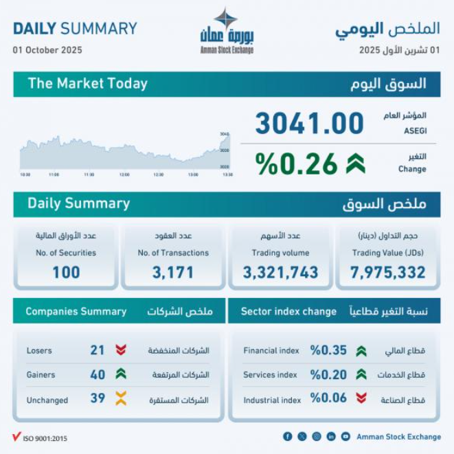 بلغ حجم التداول الإجمالي في بورصة عمان، اليوم الأربعاء، 8 ملايين دينار، وعدد الأسهم المتداولة 3.3 ملايين سهم، نفذت من خلال 3171 عقدا.وعن مستويات الأسعار، فقد ارتفع الرقم القياسي العام لأسعار الأسهم لإغلاق هذا اليوم إلى 3041 نقطة، بارتفاع نسبته 0.26 بالمئة.وبمقارنة أسعار الإغلاق للشركات المتداولة...