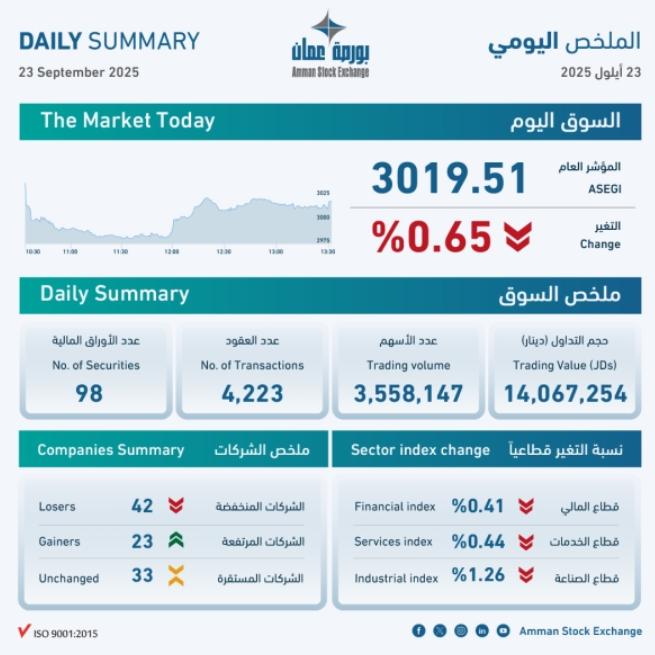 بلغ حجم التداول الإجمالي في بورصة عمان، اليوم الثلاثاء، 14.1 مليون دينار، وعدد الأسهم المتداولة 3.6 مليون سهم، نفذت من خلال 4223 عقدا.وعن مستويات الأسعار، فقد انخفض الرقم القياسي العام لأسعار الأسهم لإغلاق هذا اليوم إلى 3019 نقطة، بانخفاض نسبته 0.65 بالمئة.وبمقارنة أسعار الإغلاق للشركات المتداولة...