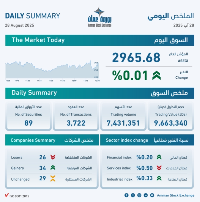 بلغ حجم التداول الإجمالي في بورصة عمان، اليوم الخميس، 5.5 مليون دينار وعدد الأسهم المتداولة 3 مليون سهم، نفذت من خلال 2607 عقود.وعن مستويات الأسعار، ارتفع الرقم القياسي العام لأسعار الأسهم لإغلاق هذا اليوم إلى 2967 نقطة، بارتفاع نسبته 0.15 بالمئة.وبمقارنة أسعار الإغلاق للشركات المتداولة والبالغ...