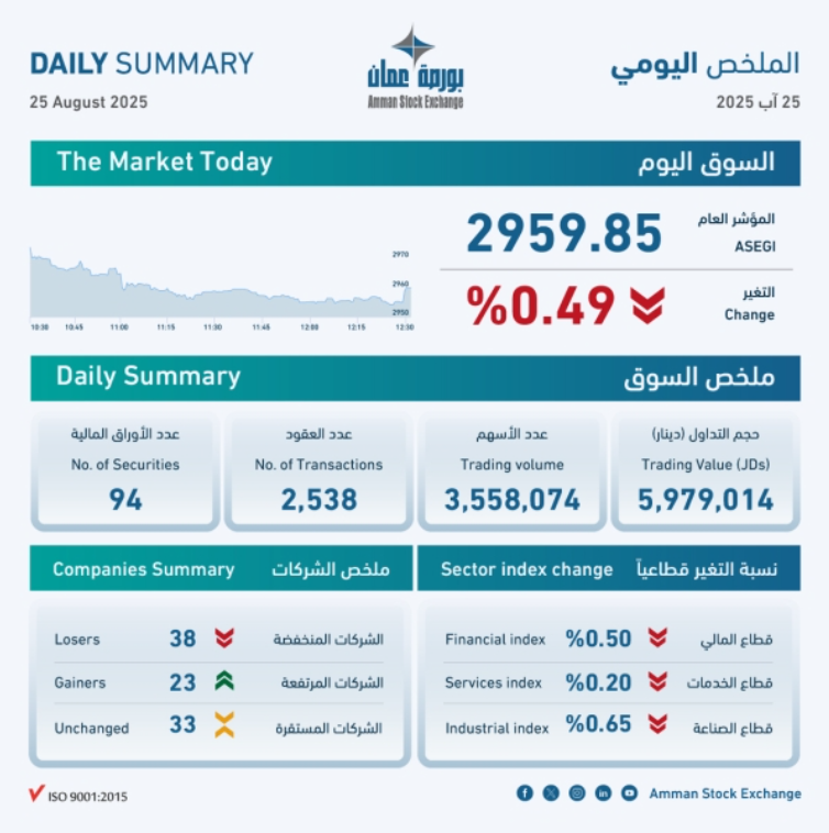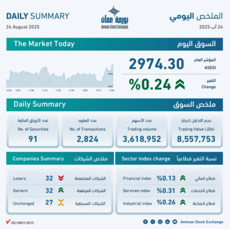 بلغ حجم التداول الإجمالي في بورصة عمان اليوم الأحد، 8.6 مليون دينار وعدد الأسهم المتداولة 3.6 مليون سهم، نفذت من خلال 2824 عقداً.وبحسب بيان للبورصة فقد ارتفع الرقم القياسي العام لأسعار الأسهم لإغلاق هذا اليوم إلى 2974 نقطة، بارتفاع نسبته 0.24 بالمئة.وبمقارنة أسعار الإغلاق للشركات المتداولة...