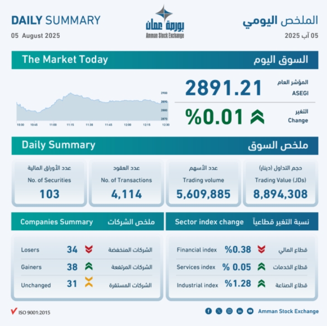 بلغ حجم التداول الإجمالي في بورصة عمان، اليوم الثلاثاء، حوالي 8.9 مليون دينار، فيما بلغ عدد الأسهم المتداولة 5.6 مليون سهم، نفذت من خلال 4096 عقدا.وعن مستويات الأسعار، فقد ارتفع الرقم القياسي العام لأسعار الأسهم إلى 2891 نقطة، بارتفاع نسبته 0.01 بالمئة.وبمقارنة أسعار الإغلاق للشركات المتداولة،...