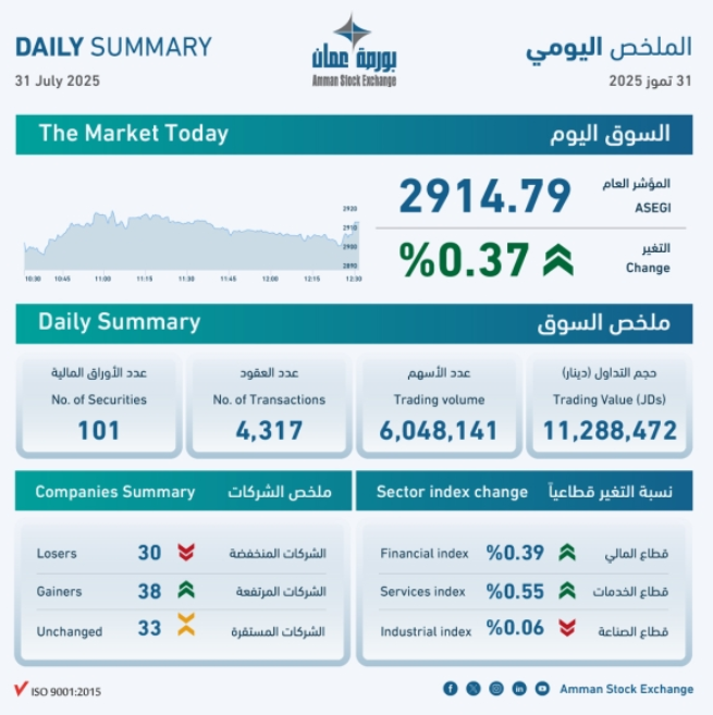 بلغ حجم التداول الإجمالي في بورصة عمان، اليوم الخميس، 11.2 مليون دينار، وعدد الأسهم المتداولة 5.9 مليون سهم، نفذت من خلال 4259 عقداً.وعن مستويات الأسعار، فقد ارتفع الرقم القياسي العام لأسعار الأسهم إلى 2914 نقطة، بارتفاع نسبته 0.37 بالمئة.وبمقارنة أسعار الإغلاق للشركات المتداولة والبالغ عددها 100...