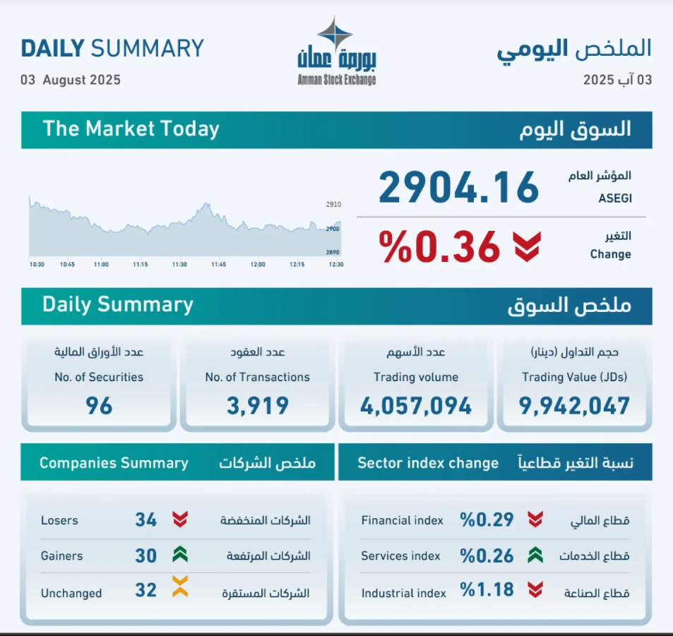 بلغ حجم التداول الإجمالي في بورصة عمان، اليوم الأحد، حوالي 9.9 مليون دينار، وعدد الأسهم المتداولة 4.1 مليون سهم، نفذت من خلال 3919 عقداً.وانخفض الرقم القياسي العام لأسعار الأسهم لإغلاق هذا اليوم إلى 2904 نقطة بانخفاض نسبته 0.36 بالمئة.وبمقارنة أسعار الإغلاق للشركات المتداولة لهذا اليوم والبالغ...