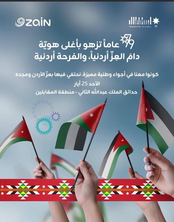 عمّان، 18 آيار 2025: قدّمت شركة زين الأردن دعوتها لجميع الأردنيين وعائلاتهم للمشاركة في الاحتفال الوطني الضخم الذي تُقيمه بمناسبة الذكرى التاسعة والسبعين لاستقلال المملكة الأردنية الهاشمية، وذلك يوم الأحد القادم الموافق 25 أيار 2025، في حدائق الملك عبدالله الثاني بمنطقة المقابلين في العاصمة عمان،...