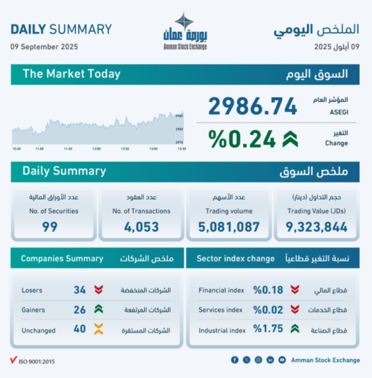 بلغ حجم التداول الإجمالي في بورصة عمان، اليوم الثلاثاء، 9.3 مليون دينار وعدد الأسهم المتداولة 4.2 مليون سهم، نفذت من خلال 3847 عقدا.وعن مستويات الأسعار، فقد ارتفع الرقم القياسي...