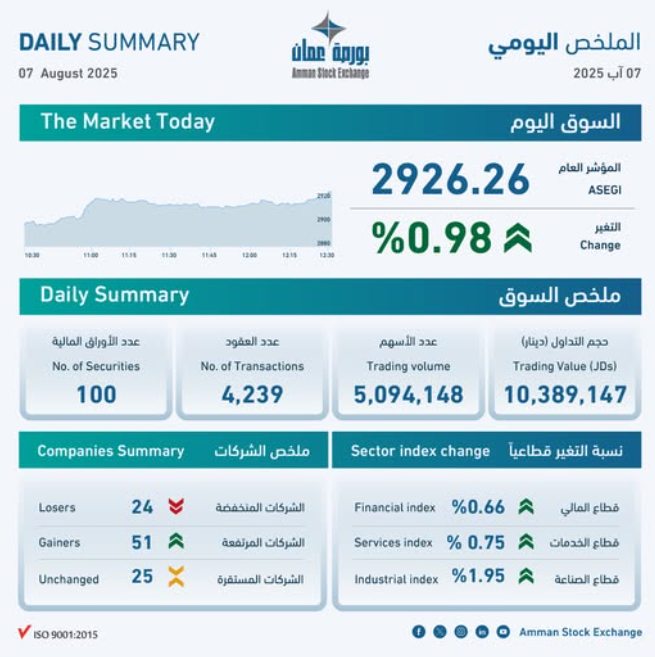 بلغ حجم التداول الإجمالي في بورصة عمان، اليوم الخميس، حوالي 10.4 مليون دينار وعدد الأسهم المتداولة 5.1 مليون سهم، نفذت من خلال 4239 عقداً.وعن مستويات الأسعار، ارتفع الرقم...