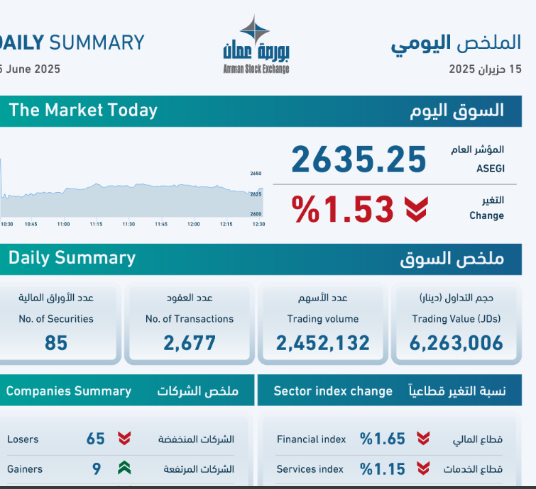 غلقت بورصة عمان، اليوم الأحد، تداولاتها على انخفاض نسبته 1.53 بالمئة الى مستوى 2635 نقطة.وبلغت كمية الأسهم المتداولة نحو 2.4 مليون سهم بقيمة إجمالية بلغت نحو 6.2 مليون دينار...