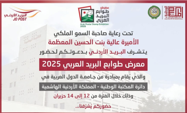 أعلن البريد الأردني عن إقامة معرض طوابع البريد العربي لأول مرة في الأردن، تحت رعاية سمو الاميرة عالية بنت الحسين في الفترة مابين 12-14 يونيو / حزيران 2025، في مبنى دائرة المكتبة...