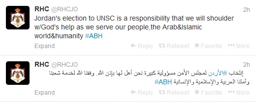 نشر حساب الديوان الملكي الهاشمي على تويتر، ليل الجمعة السبت، تغريدة لجلالة الملك عبدالله الثاني قال فيها إن " إنتخاب اﻷردن لمجلس اﻷمن مسؤولية كبيرة نحن أهل لها بإذن الله. وفقنا الله لخدمة شعبنا وأمتنا العربية والإسلامية والإنسانية."