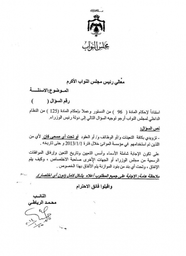 وأضاف خلال كتاب أرسله الرياطي للنسور - وصل "زاد الأردن" نسخة منه - " أذا أجبتم عن السؤال بشكل كامل ،فستعلمون في حينه من الذي يعين او يوظف بشكل غير قانون وبالواسطات" .