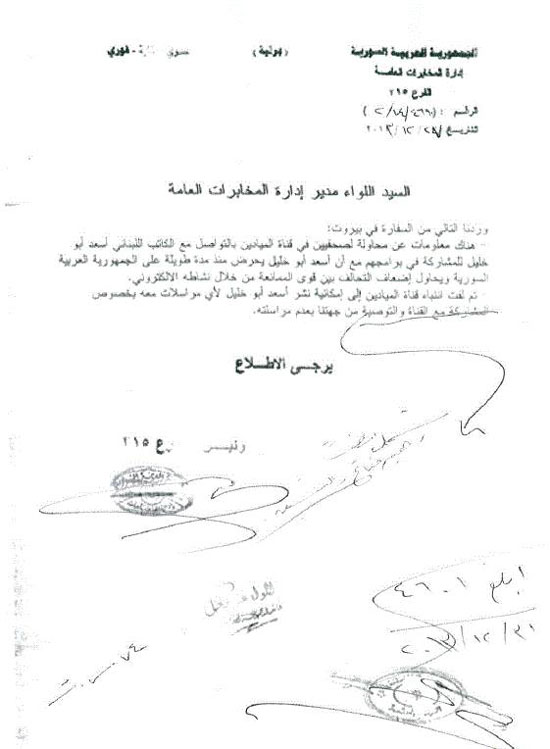 رصد - كشفت مجموعة برقيات نشرتها صفحة شبكة "فلاش" في "فيسبوك" عن أوجه تعاون بين الإدارة العامة للمخابرات في دمشق التابعة للنظام السوري، وعدد من الكتّاب والصحفيين المعروفين في عددٍ من الدول العربيّة من بينها الأردن ولبنان ومصر وفلسطين.