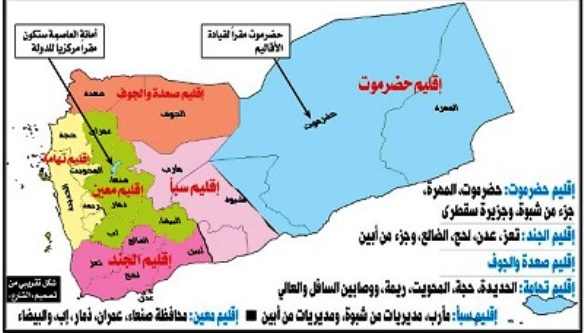 أعلنت لجنة الأقاليم التي شكلها الرئيس اليمني عبدربه منصور هادي الإعلان في صنعاء عن تقسيم اليمن إلى 6 أقاليم في دولة اتحادية، الأمر الذي يحرم الحوثيين من منفذ بحري.