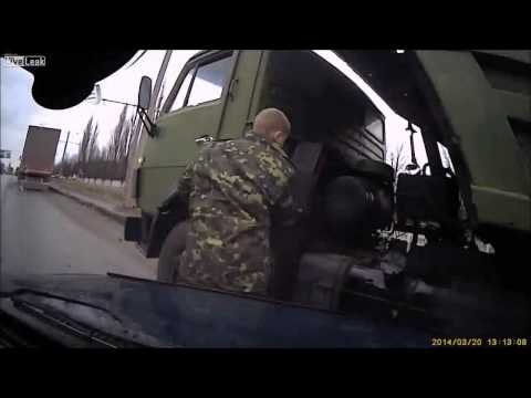 لكن لم ينته الأمر عند هذا الحد فقد اندفعت السيارة حيث الكاميرا، بفعل قوة الاصطدام، في مسار غير المسار الذي كانت تتحرك فيه، وكادت تتسبب بحادث خطر ضحيته جندي أوكراني كان يقوم ببعض أعمال الصيانة لشاحنة عسكرية.